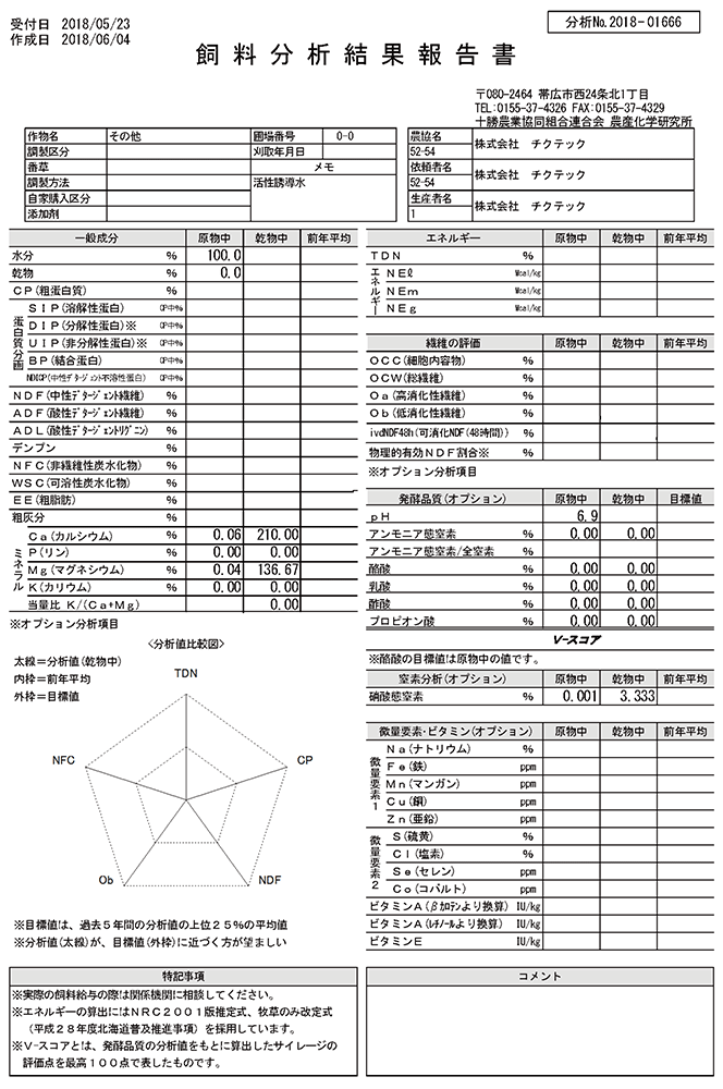 | 発酵 | 植物などを原料としたサイレージ及びTMR(混合飼料)などに用いても、発酵菌を健康に育て、腐敗菌を抑え、良質な貯蔵製品ができます。腐敗を抑える事で有害ガスが発生しにくくなります。発酵速度が緩くなり、栄養ロスは減り、嗜好性の向上が期待できます。 |
