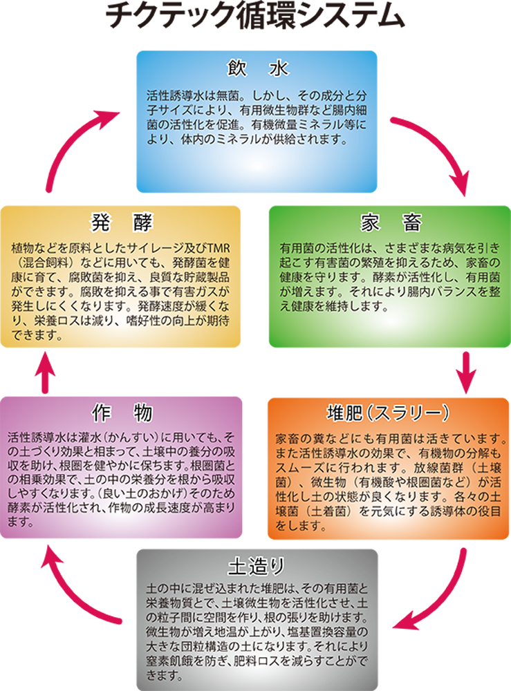 | 飲水 | 活性誘導水は無菌。しかし、その成分と分子サイズにより、有用微生物群など腸内細菌の活性化を促進。有機微量ミネラル等により、体内のミネラルが供給されます。 |